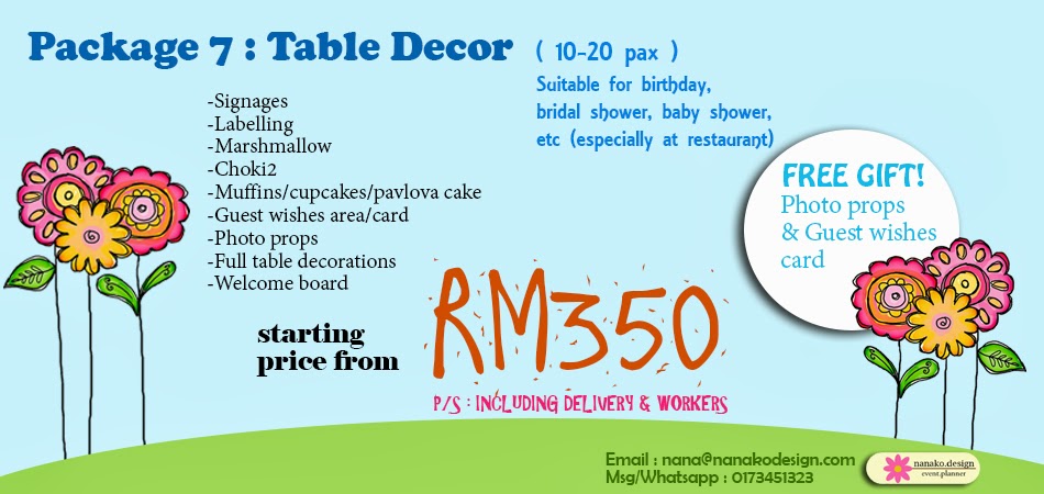 Introducing our new event & decor promotion price until end of March 2014. Suitable for private and social gathering like birthday parties, weddings, bridal shower, baby showers and dinner parties.